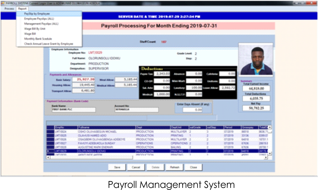 Our PMS helps manage the computation, disbursement, and reporting of employees' salaries efficiently and accurately monthly. It has an in-built mechanism that sends monthly wage bills to the Central Accounts for Profit & Loss Account or Statements of Comprehensive Income, Staff Receivables and the Trial Balance financial reporting. Indeed, the payroll period is governed by the Central Account System.